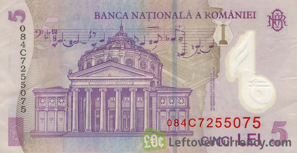 The National Bank of Romania issued Romanian Leu banknotes in 8 different denominations, including this 5 Romanian Lei banknote (George Enescu). They are part of the current Romanian Lei banknotes series. The National Bank of Romania started issuing these 5 Romanian Leu banknotes in 2005. They are currently still in circulation.