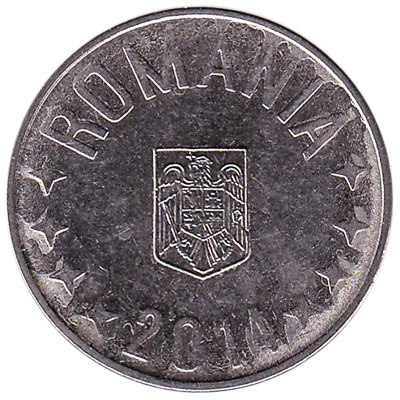 The coin of 10 Romanian bani weighs 4 grams and measures 20.5mm across. The back side of the nickel plated steel piece of 10 bani features the Romanian coat of arms and eight four-pointed stars.