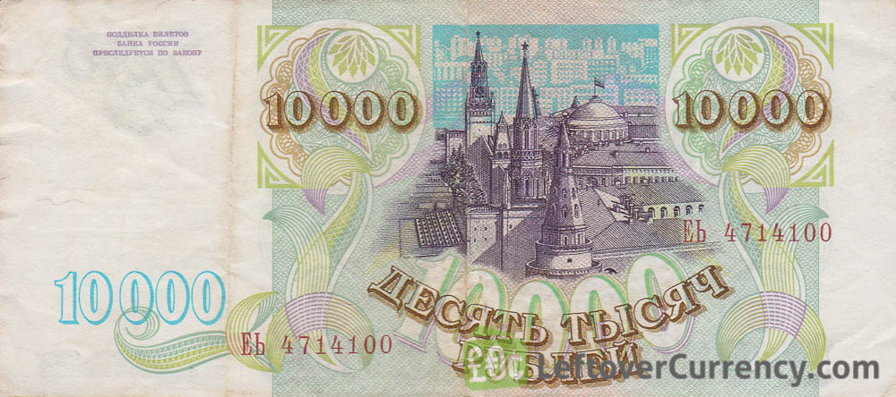 The 10,000 Russian Ruble banknote from 1993 features the buildings of the Kremlin. On the front of the old 10,000 ruble note is the Russian flag flying over Red Square. On the back side is a view on the Kremlin’s towers.