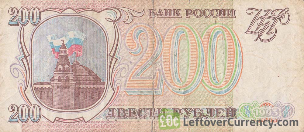 The Bank of Russia issued Russian Ruble banknotes in 10 different denominations, including this 200 Russian Rubles banknote 1993. They are part of the old Russian Ruble banknotes series. The Bank of Russia started issuing these 200 Russian Ruble banknotes in 1993. They were withdrawn from circulation in 1995.