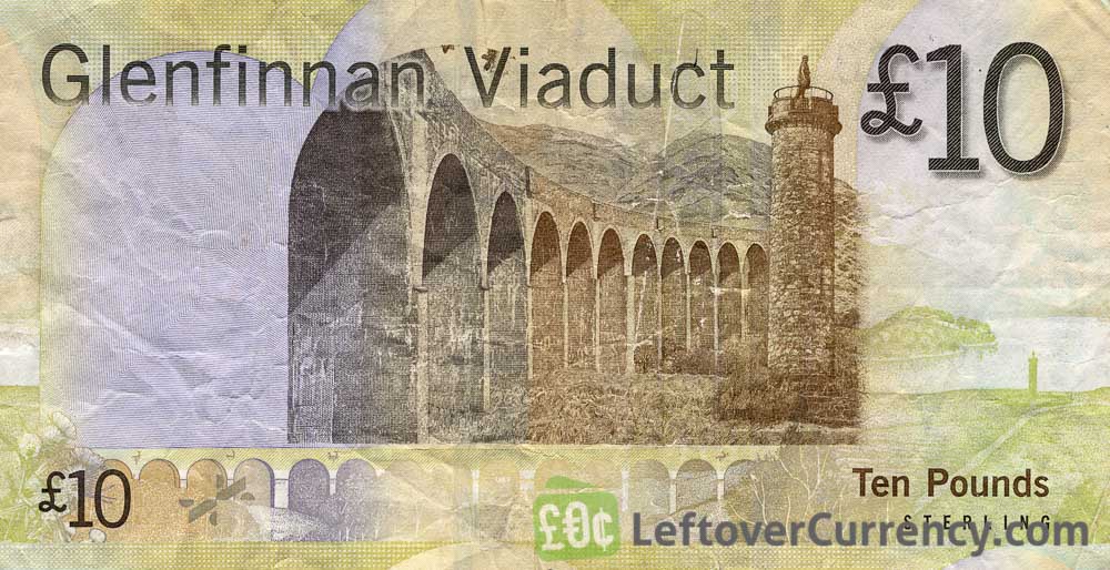 This sand colored ten Scottish pounds note measures 142mm by 75mm. The paper banknote contains the words ‘Bank of Scotland’. It is part of the so-called Bridges series. Scottish historical novelist, Sir Walter Scott, 1st Baronet, FRSE is on the frontside of the £10 note. The bridge on the backside is Glenfinnan Viaduct on the West Highland Line.