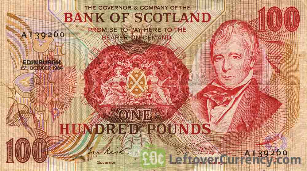 Repeat these steps for any other notes and coins you want to exchange. Complete checkout and get paid within 5 days of receiving your currencies. To exchange your Bank of Scotland 100 Pounds banknote (1970-1994 series) for cash: add it to your wallet now!