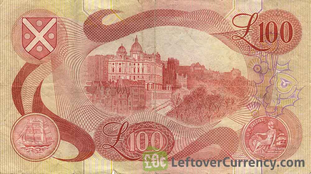 The Bank of Scotland issued Scottish Pound banknotes in 7 different denominations, including this Bank of Scotland 100 Pounds banknote (1970-1994 series). They are part of the withdrawn Bank of Scotland banknotes series. The Bank of Scotland started issuing these 100 Scottish Pound banknotes in 1970. They were withdrawn from circulation in 1994.
