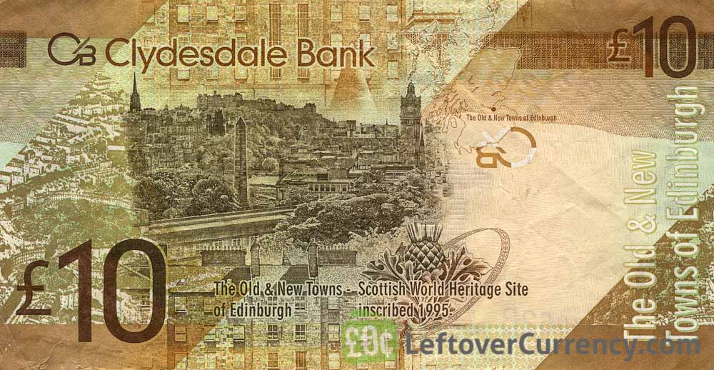 The Clydesdale Bank issued Scottish Pound banknotes in 7 different denominations, including this Clydesdale Bank 10 Pounds banknote. They are part of the withdrawn Clydesdale Bank banknotes series. The Clydesdale Bank started issuing these 10 Scottish Pound banknotes in 2009. They were withdrawn from circulation in 2017.