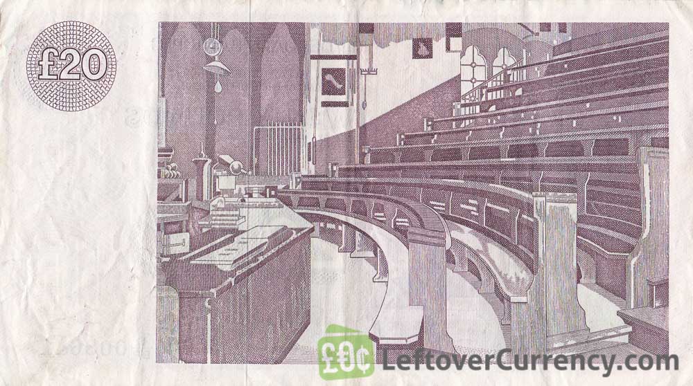 The lilac colored £20 banknote features Scottish engineer Lord Kelvin. On the reverse side of the twenty pound note is a lecture hall in Glasgow University.