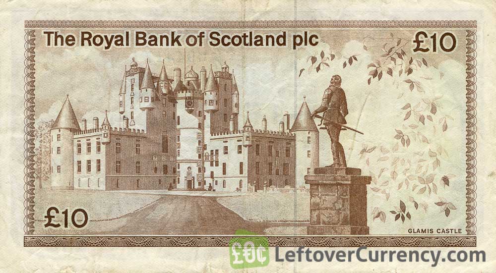 The banknote of ten pounds sterling features Glamis Castle in Glamis, Scotland. The words ‘The Royal Bank of Scotland plc’ are printed on the note.