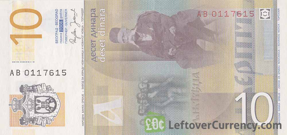 The National Bank of Serbia issued Serbian Dinar banknotes in 10 different denominations, including this 10 Serbian Dinara banknote. They are part of the current Serbian Dinar banknotes series. The National Bank of Serbia started issuing these 10 Serbian Dinar banknotes in 2006. They are currently still in circulation.