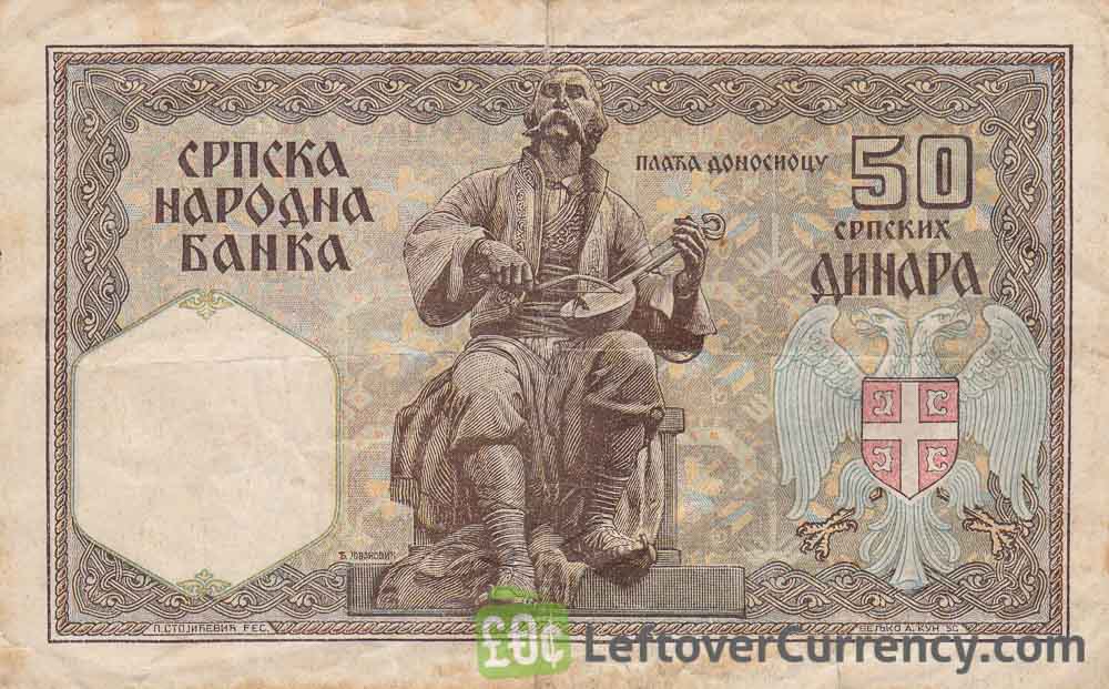 The 50 Serbian dinara banknote from 1941 features a woman with crown of laurel bay leaves on the front side. On the back side is a seated guslar Balkan singer with gusle, a musical instrument similar to a violin.