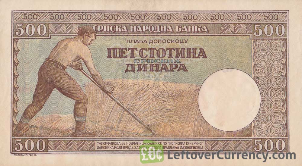 This banknote of 500 Dinar from Serbia has a farmer on both sides: Sowing on the front side and harvesting on the back side. The 500 dinara bill was in use during the German occupation of Serbia during World War II.