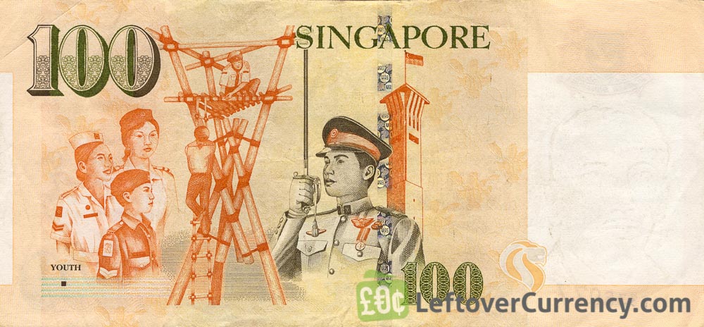 The banknote of one hundred dollars shows the first President of Singapore, Encik Yusof bin Ishak. The $100 SGD note is issued in a paper and a polymer plastic version. On the backside of this orange and brown colored note is an image of the St John’s Ambulance Brigade and a National Police cadet.
