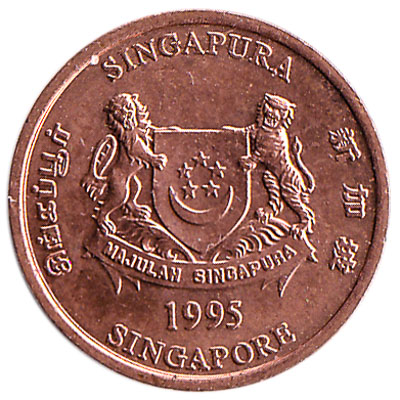 The Monetary Authority of Singapore issued Singapore Dollar coins in 8 different denominations, including this 1 Cent coin Singapore (Second series). They are part of the Singapore Dollar coins series. The Monetary Authority of Singapore started issuing these 0.01 Singapore Dollar coins in 1987. They were withdrawn from circulation in 2012.