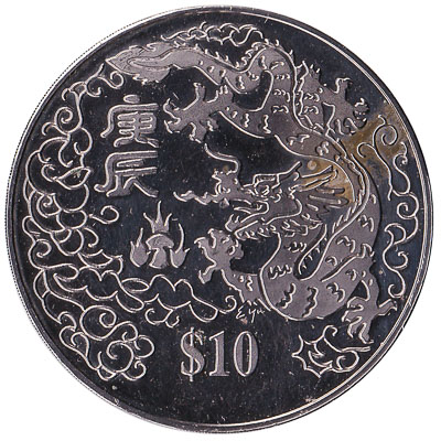 Commemorative coins are issued in Singapore to celebrate the new Lunar Year. This example was issued in 2000 to commemorate the Year of the Dragon. Commemorative $10 coins from Singapore are not in normal circulation. They are used as gift, rather than as a means of payment.