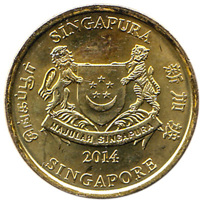 The Monetary Authority of Singapore issued Singapore Dollar coins in 8 different denominations, including this 5 Cents coin Singapore (Third series). They are part of the Singapore Dollar coins series. The Monetary Authority of Singapore started issuing these 0.05 Singapore Dollar coins in 2013. They are currently still in circulation.
