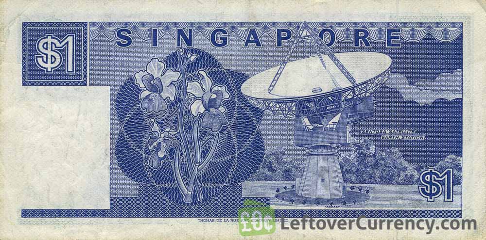 The blue-green colored bill of one dollar is 125mm wide by 63mm high. Text on the paper currency note reads ‘Singapore – Singapura’. The $1 SGD note features belongs to the Ship banknote series and features a sha chuan traditional sailing ship. On the backside is a satellite dish station.