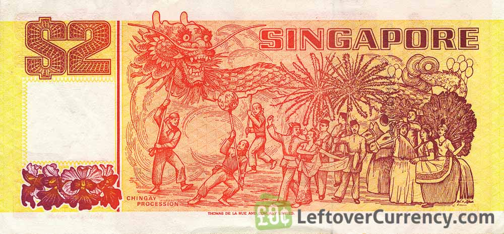 This orange two dollars note measures 133mm by 63mm. The words ‘Singapore – Singapura’ are printed on the paper banknote. This orange colored $2 note belongs to the so-called Ship Series. It features a tongkang sailing boat. On the backside of the 2 SGD bill is the Chingay Parade in Singapore, a traditional Chinese New Year event with dancing dragons, fireworks and prancing lions.