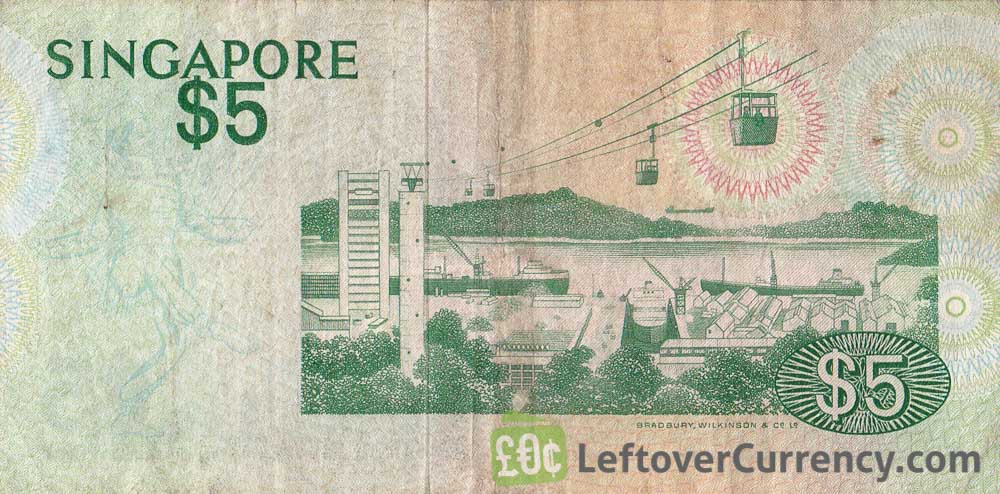 The green-purple-orange note of five dollars measures 133mm by 66mm. Text on the paper banknote reads ‘Singapore’. The bird on the $5 SGD note is a red-whiskered bulbul. On the back of the five Singapore dollars note are cable cars over Singapore harbour.