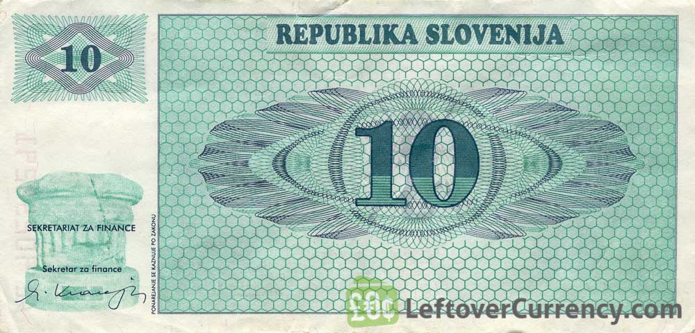 The Bank of Slovenia issued Slovenian Tolar banknotes in 15 different denominations, including this 10 Slovenian Tolars banknote (Triglav mountain series). They are part of the Slovenian Tolar banknotes series. The Bank of Slovenia started issuing these 10 Slovenian Tolar banknotes in 1991. They were withdrawn from circulation in 1992.
