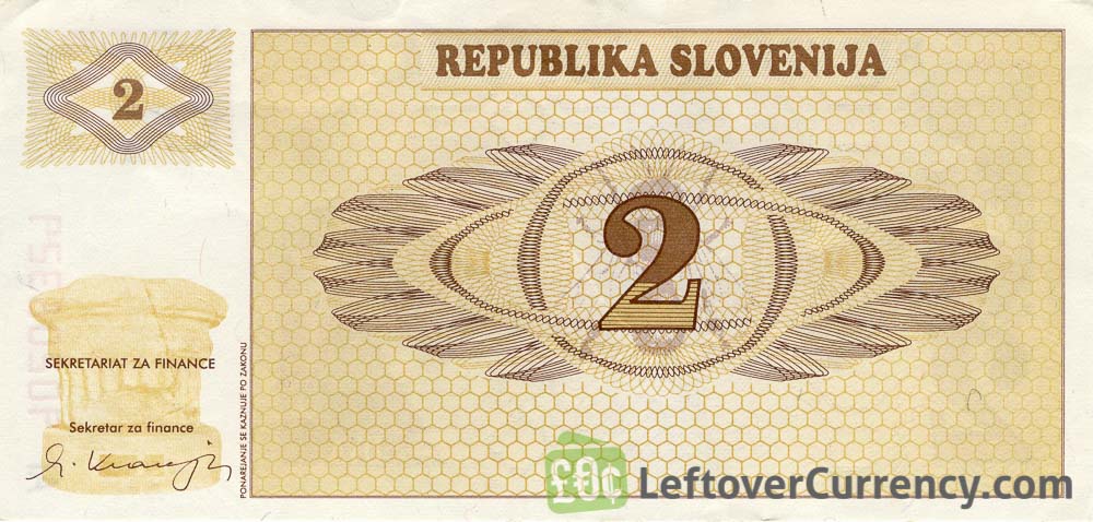 The Bank of Slovenia issued Slovenian Tolar banknotes in 15 different denominations, including this 2 Slovenian Tolars banknote (Triglav mountain series). They are part of the Slovenian Tolar banknotes series. The Bank of Slovenia started issuing these 2 Slovenian Tolar banknotes in 1991. They were withdrawn from circulation in 1992.