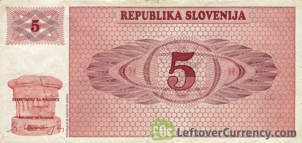 The Bank of Slovenia issued Slovenian Tolar banknotes in 15 different denominations, including this 5 Slovenian Tolars banknote (Triglav mountain series). They are part of the Slovenian Tolar banknotes series. The Bank of Slovenia started issuing these 5 Slovenian Tolar banknotes in 1991. They were withdrawn from circulation in 1992.