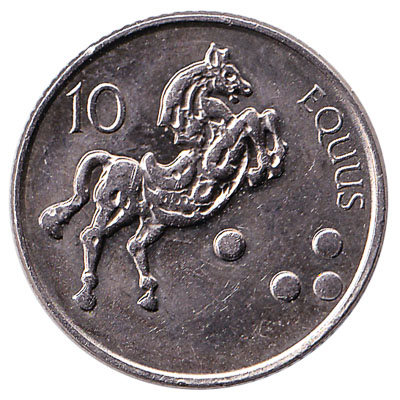 The Slovenian silver-colored coin of 10 deset tolarjev has the image of a horse ‘equus’. The ten tolar coin has the text ‘Republika Slovenija’.