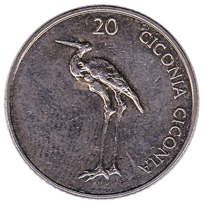 This silver-colored Slovenian dvajset 20 tolarjev coin features a white stork ‘ciconia ciconia’. Text on the twenty tolar coin reads ‘Republika Slovenija’.