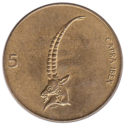 The Slovenian gold-colored coin of 5 pet tolarjev features an alpine ibex ‘capra ibex’. Republika Slovenija’ is the text inscripted on the five tolar coin.