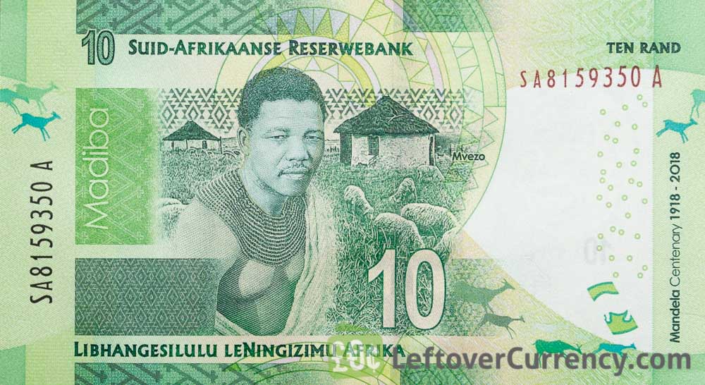 The R10 Madiba banknote features Nelson Mandela’s birthplace Mvezo in the hills of Eastern Cape. The backside shows an image of a young Mandela with in the background grazing sheep and huts.