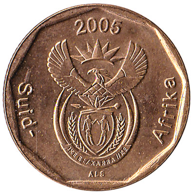 The South African Reserve Bank issued South African Rand coins in 9 different denominations, including this 20 cents coin South Africa. They are part of the South African Rand coins series. The South African Reserve Bank started issuing these 0.2 South African Rand coins in 1989. They are currently still in circulation.