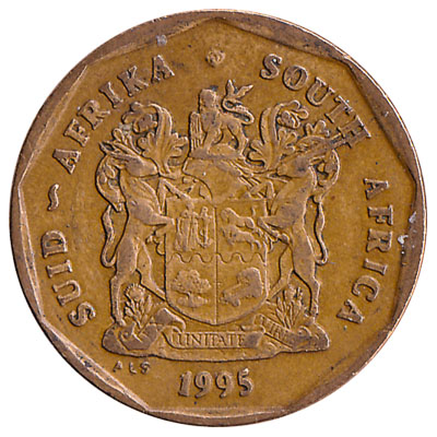 The South African Reserve Bank issued South African Rand coins in 9 different denominations, including this 50 cents coin South Africa. They are part of the South African Rand coins series. The South African Reserve Bank started issuing these 0.5 South African Rand coins in 1989. They are currently still in circulation.