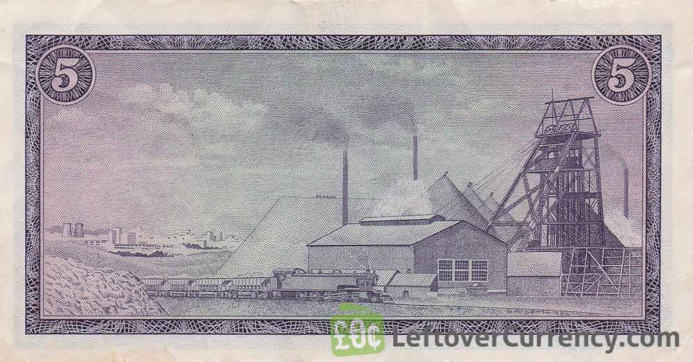 The purple coloured framed 5 rand banknote from South Africa is themed around industry: On the front side is a factory. The back side features an ore mine and a steam train. The portrait on this old 5 rand bill is that of Dutch colonial administrator Jan van Riebeeck.