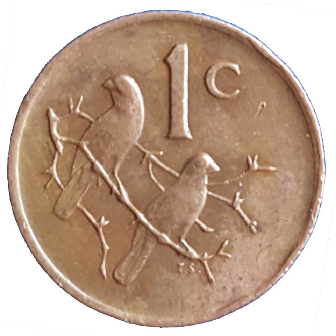The old bronze 1 cent coin from South Africa has a diameter of 19.1mm and is larger than the current South African 1c piece. The design features two cape sparrows on the side of the denomination. The reverse side of the withdrawn 1c coin features the South African coat of arms (1970-1989) or the portrait of Dutch navigator Jan van Riebeeck (1965-1969).