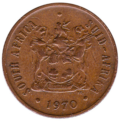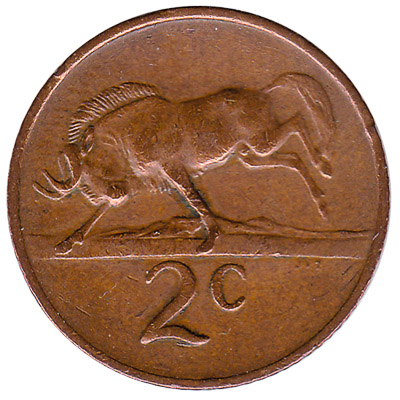 The South African Reserve Bank issued South African Rand coins in 8 different denominations, including this 2 cents coin South Africa (large type). They are part of the withdrawn South African Rand coins series. The South African Reserve Bank started issuing these 0.02 South African Rand coins in 1965. They were withdrawn from circulation in 1990.