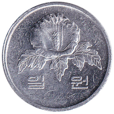 The Bank of Korea issued South Korean Won coins in 7 different denominations, including this 1 South Korean won coin. They are part of the South Korean Won coins series. The Bank of Korea started issuing these 1 South Korean Won coins in 1983. They are currently still in circulation.