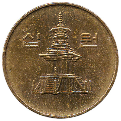 The Bank of Korea issued South Korean Won coins in 7 different denominations, including this 10 South Korean won coin (Series III). They are part of the South Korean Won coins series. The Bank of Korea started issuing these 10 South Korean Won coins in 1983. They are currently still in circulation.