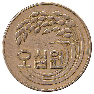The Bank of Korea issued South Korean Won coins in 7 different denominations, including this 50 South Korean won coin (old type). They are part of the South Korean Won coins series. The Bank of Korea started issuing these 50 South Korean Won coins in 1972. They were withdrawn from circulation in 1982.