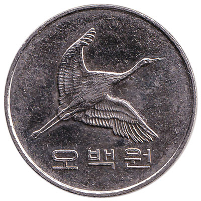 The silver coloured 500 won coin from South Korea is made from copper-nickel. The bird on the reverse side of the 500 KRW coin is a flying red-crowned crane, also known as Manchurian crane. The coin’s value is written out in Hangul, the alphabet used for the Korean language. The reverse side of the 500 South Korean Won piece has the denomination and date of issue in the Western alphabet, along with the value and ‘Bank of Korea’ written in Hangul.