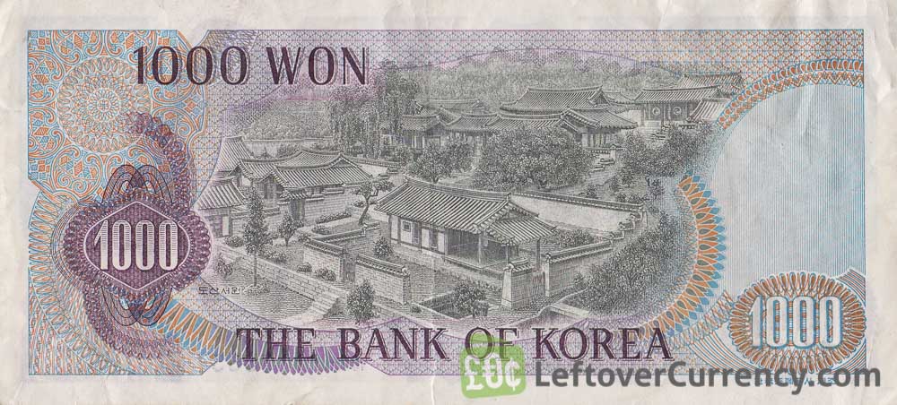 The purple coloured 1000 won banknote from the non-dated 1975 issue features a portrait of Confucian scholar Yi Hwang on the front, and buildings of the Dosan Seowon Academy on the back side. On the front side of this old 1000 South Korean won banknote are four flowers.