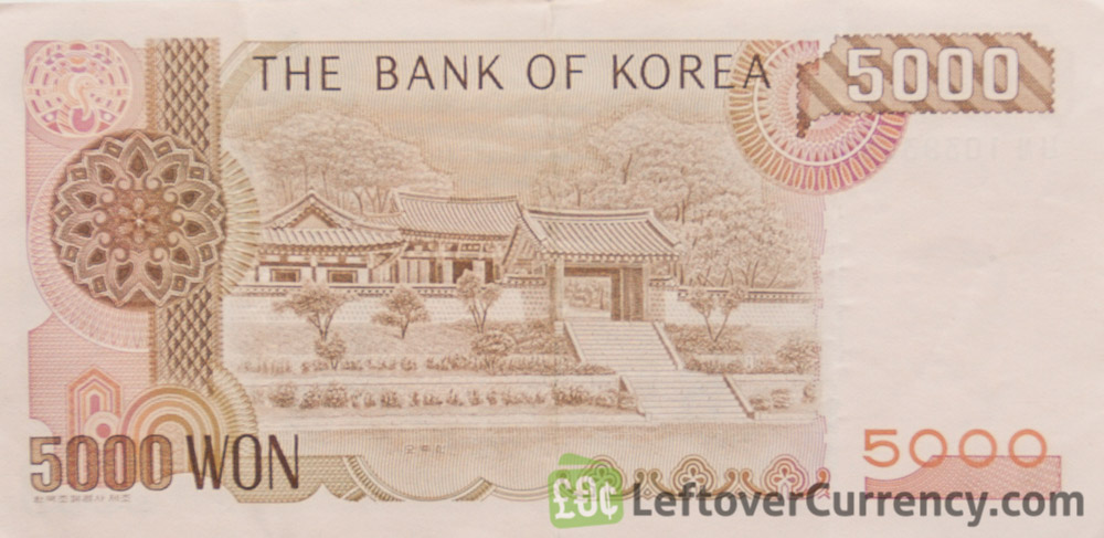 This old type 5,000 won South Korean banknote depicts Yi l,one of the most prominent Confucian scholars from the Joseon Dynasty, who is also known by his pen name ‘Yulgok’. The reverse of the 5000 Korean Won note shows Ojukheon, the house where Yi l was born, and home to his mother Shin Saimdang, also an acclainmed Confucian practitioner.