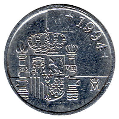 The Spanish coin of 1 peseta weighs less than a gram and is made of aluminium, measuring 14mm across. The text on the coin reads ‘Juan Carlos I España’. We exchange all one peseta coins dated 1989 and later.