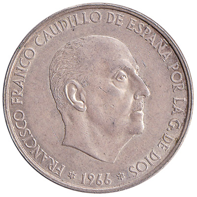 The Banco de España issued Spanish Peseta coins in 11 different denominations, including this 100 Spanish Pesetas coin (Francisco Franco). They are part of the Spanish Peseta coins series. The Banco de España started issuing these 100 Spanish Peseta coins in 1966. They were withdrawn from circulation in 1982.