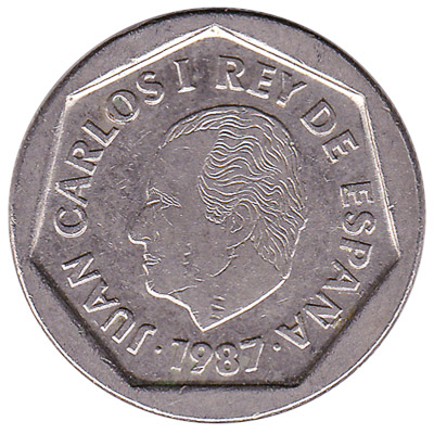The Banco de España issued Spanish Peseta coins in 11 different denominations, including this 200 Spanish Pesetas coin (Heptagon). They are part of the Spanish Peseta coins series. The Banco de España started issuing these 200 Spanish Peseta coins in 1986. They were withdrawn from circulation in 1998.