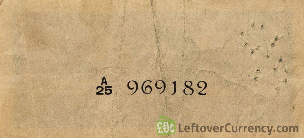 This WWII-era banknote of ten cents from Ceylon is dated 1942 or 1943. It has the portrait of King George VI in the centre on the obverse side. The reverse side is blank apart from the serial number.
