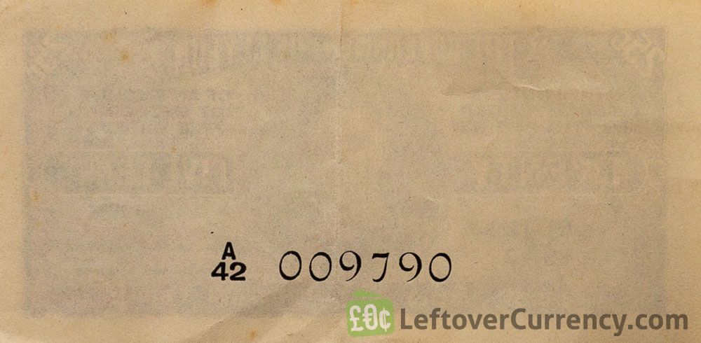 The banknote of 25c from Ceylon has the portrait of King George VI in the centre on the obverse side. The reverse side is blank except for the serial number. The banknote is dated 1942, 1947, 1948 or 1949.