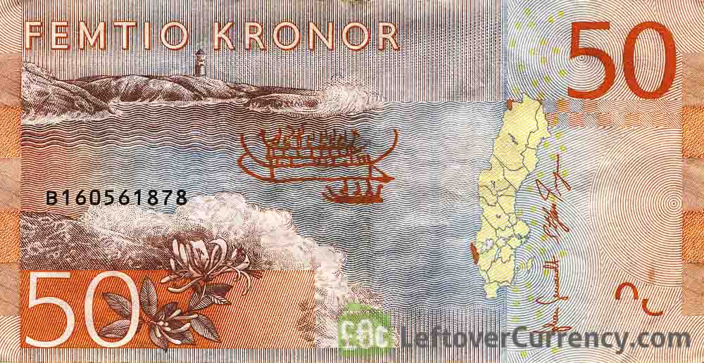 The 50 kronor banknote features Swedish singer Evert Taube and the Swedish region of Bohuslän. On the front of the Femtio Kronor banknote is a portrait of the artist, musical sheets and a boat. On the back side of the fifty kronor note is a bay view with choppy waters and a lighthouse.