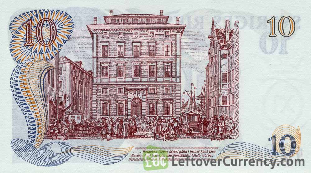 The Sveriges Riksbank issued Swedish Krona banknotes in 10 different denominations, including this 10 Swedish Kronor banknote (Svea commemorative). They are part of the withdrawn Swedish Krona banknotes series. The Sveriges Riksbank started issuing these 10 Swedish Krona banknotes in 1968. They were withdrawn from circulation in 1998.