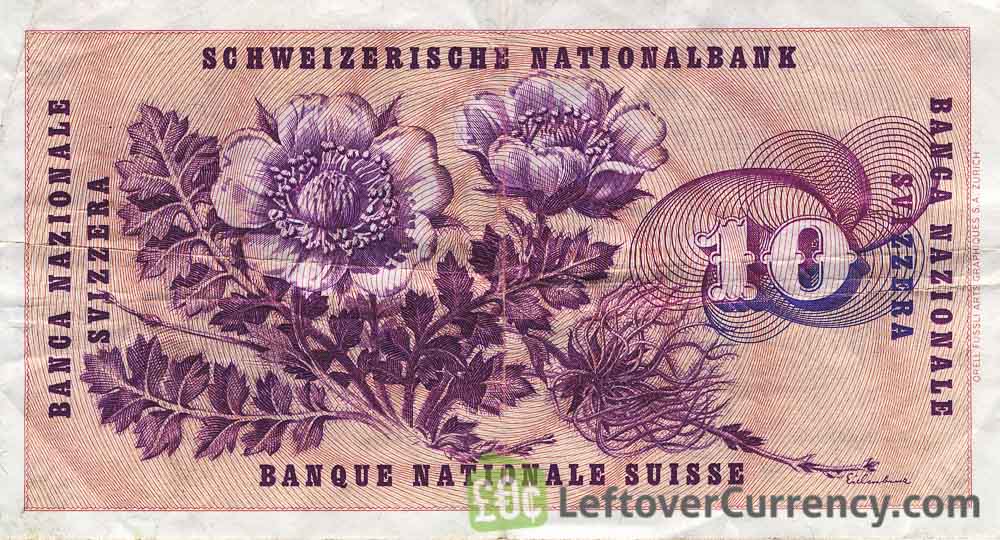 - Text: 10, Banca Nazionale Svizzera, Banque Nationale Suisse, Dieci Franchi, Dix Francs, Schweizerische Nationalbank, Zehn Franken
