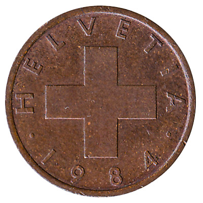 The Swissmint issued Swiss Franc coins in 11 different denominations, including this 1 Rappen coin Switzerland. They are part of the Swiss Franc coins series. The Swissmint started issuing these 0.01 Swiss Franc coins in 1850. They were withdrawn from circulation in 1952.