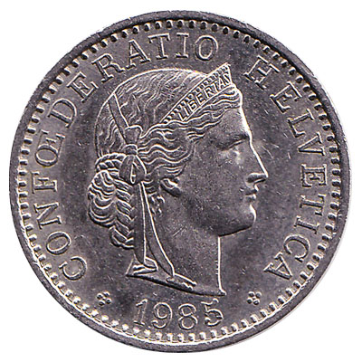 The coin of 20 rappen has a diameter of 21.05mm and a weight of 4 grams. On the copper-nickel coin of 0.20 CHF, the inscription reads ‘Helvetica’, Latin for ‘Switzerland’.