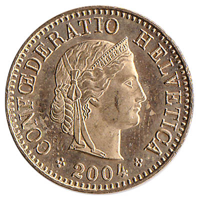 This gold-colored 5 rappen coin measures 17.15mm across and weighs 1.8g. On the aluminium-bronze coin of 0.05 CHF, the inscription reads ‘Helvetica’.