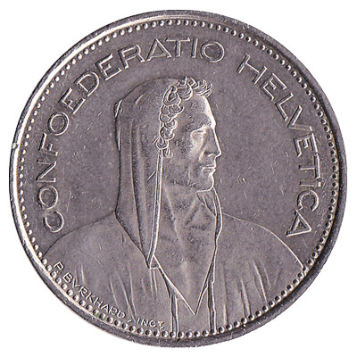 The Swissmint issued Swiss Franc coins in 11 different denominations, including this 5 Swiss Francs coin. They are part of the Swiss Franc coins series. The Swissmint started issuing these 5 Swiss Franc coins in 1931. They are currently still in circulation.